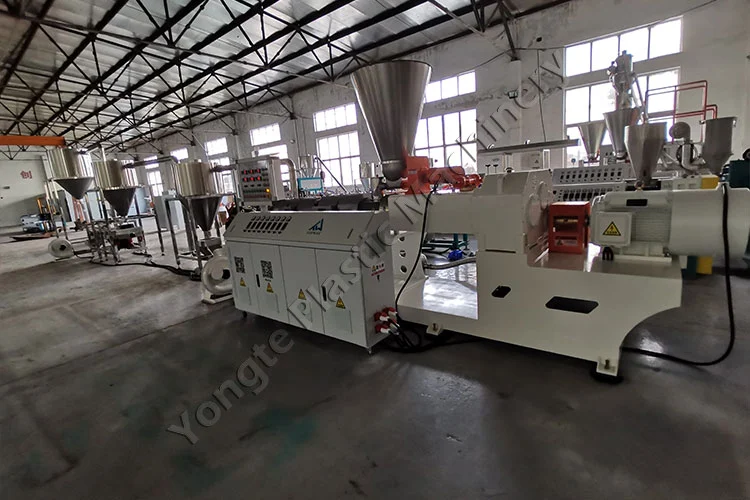 Em 2024, projetamos uma máquina de pelotização de composto de PVC personalizada para um cliente polonês, projetada especificamente para produzir grânulos de masterbatch de PVC a partir de PVC reciclado e enchimento de CaCO₃. O conteúdo do enchimento CaCO₃ pode ser ajustado de forma flexível entre 40% e 80% para se alinhar às especificações de produção do cliente. Os principais componentes incluem um alimentador automático, uma extrusora cônica de rosca dupla SJSZ80/156 (motor de 75kW com inversor de frequência ABB, consumindo ~50KW durante operação estável), uma matriz de pelotização a quente para corte uniforme de grânulos e um sistema de resfriamento e transporte rápido de ar de três estágios em aço inoxidável 304. A máquina atinge uma capacidade de produção de 300-400 kg/hora e é construída para operação contínua 24 horas por dia, 7 dias por semana, sem tempo de inatividade. A instalação foi perfeita, apoiada pela equipe de especialistas da Yongte, que forneceu assistência ponta a ponta. O treinamento pós-instalação no local capacitou a equipe do cliente a operar o equipamento com proficiência, enquanto o suporte técnico remoto por meio de orientação por vídeo garantiu a resolução imediata de quaisquer problemas, mantendo a produção ininterrupta e o desempenho máximo.